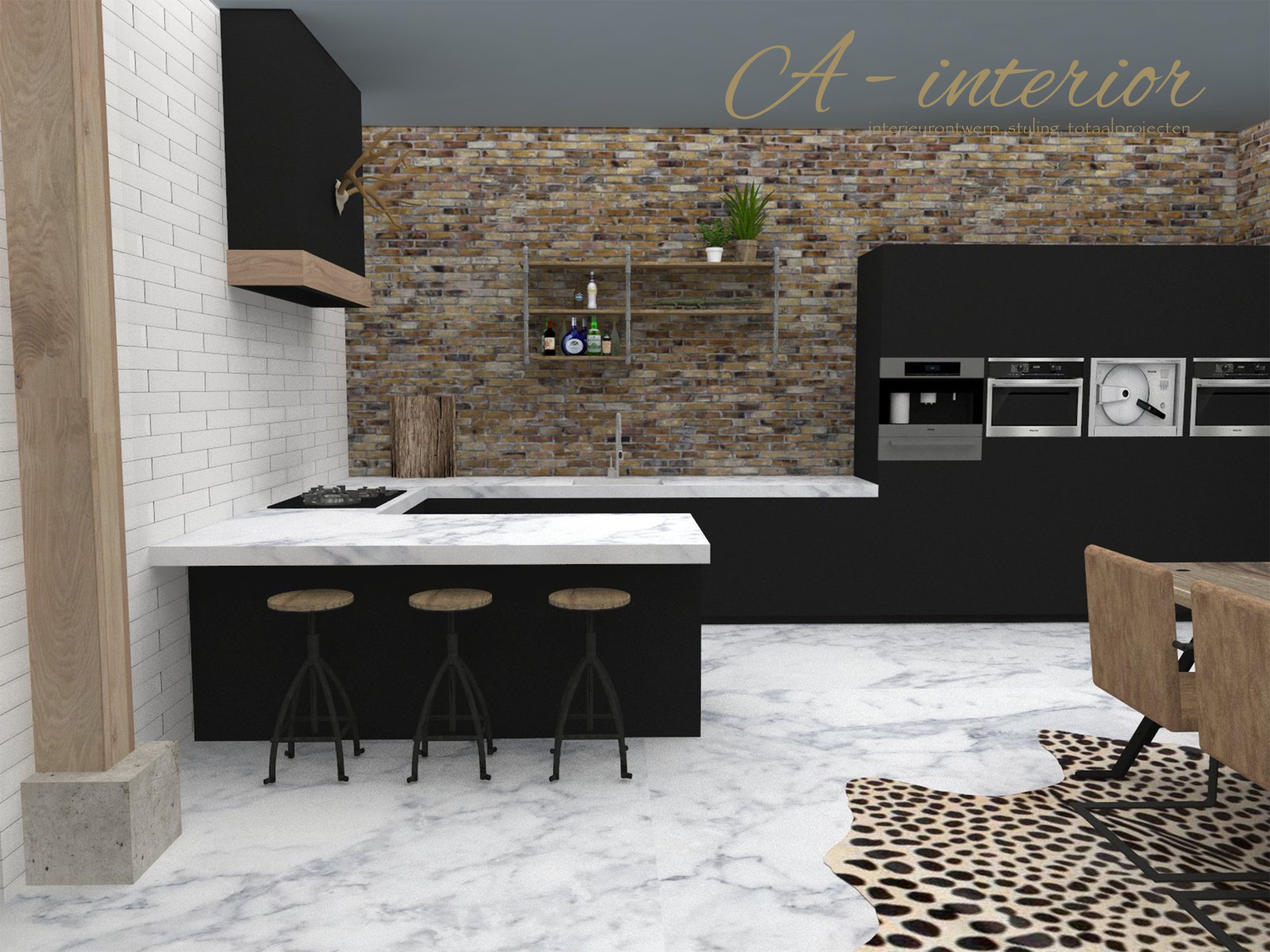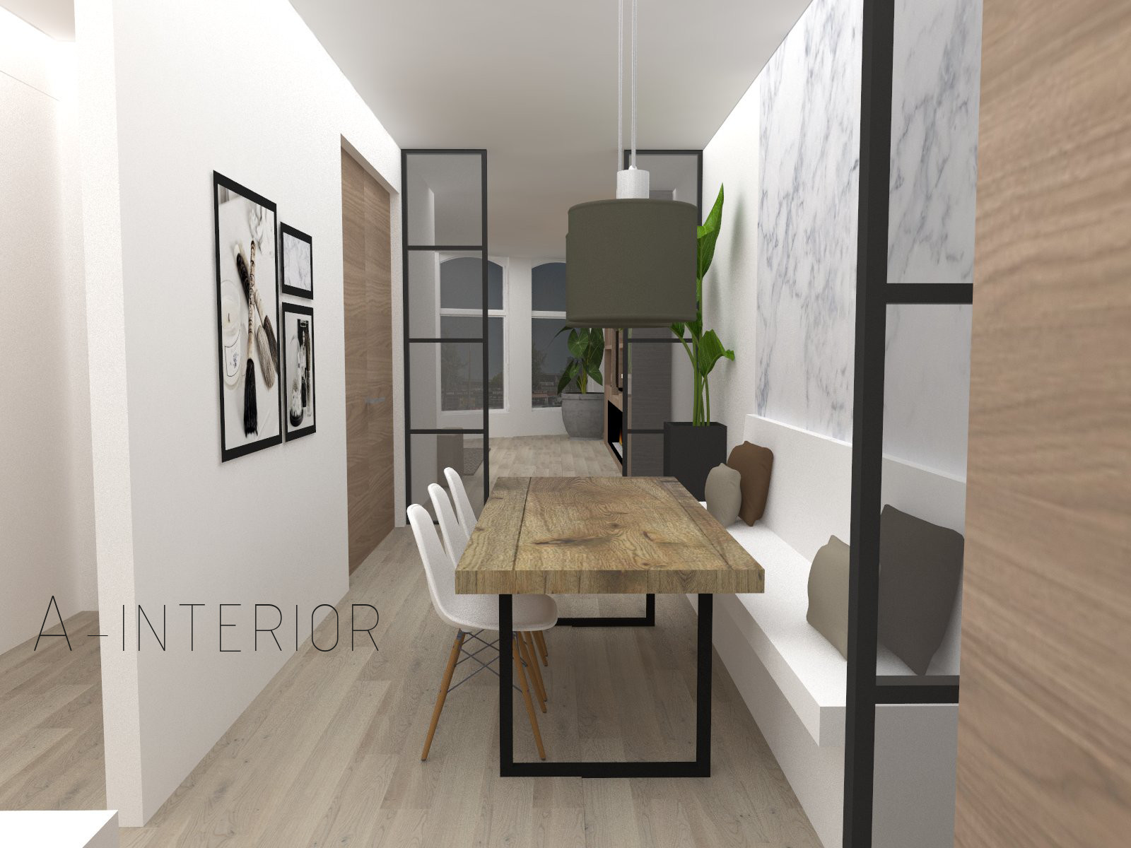 Bij deze woning heeft A-interior de woonkamer, keuken, eetgedeelte en badkamer ontworpen. De klant wilde de ruimtes in een industriële stijl.