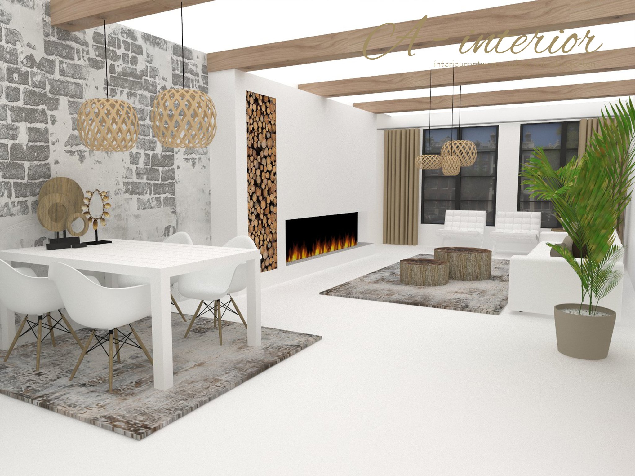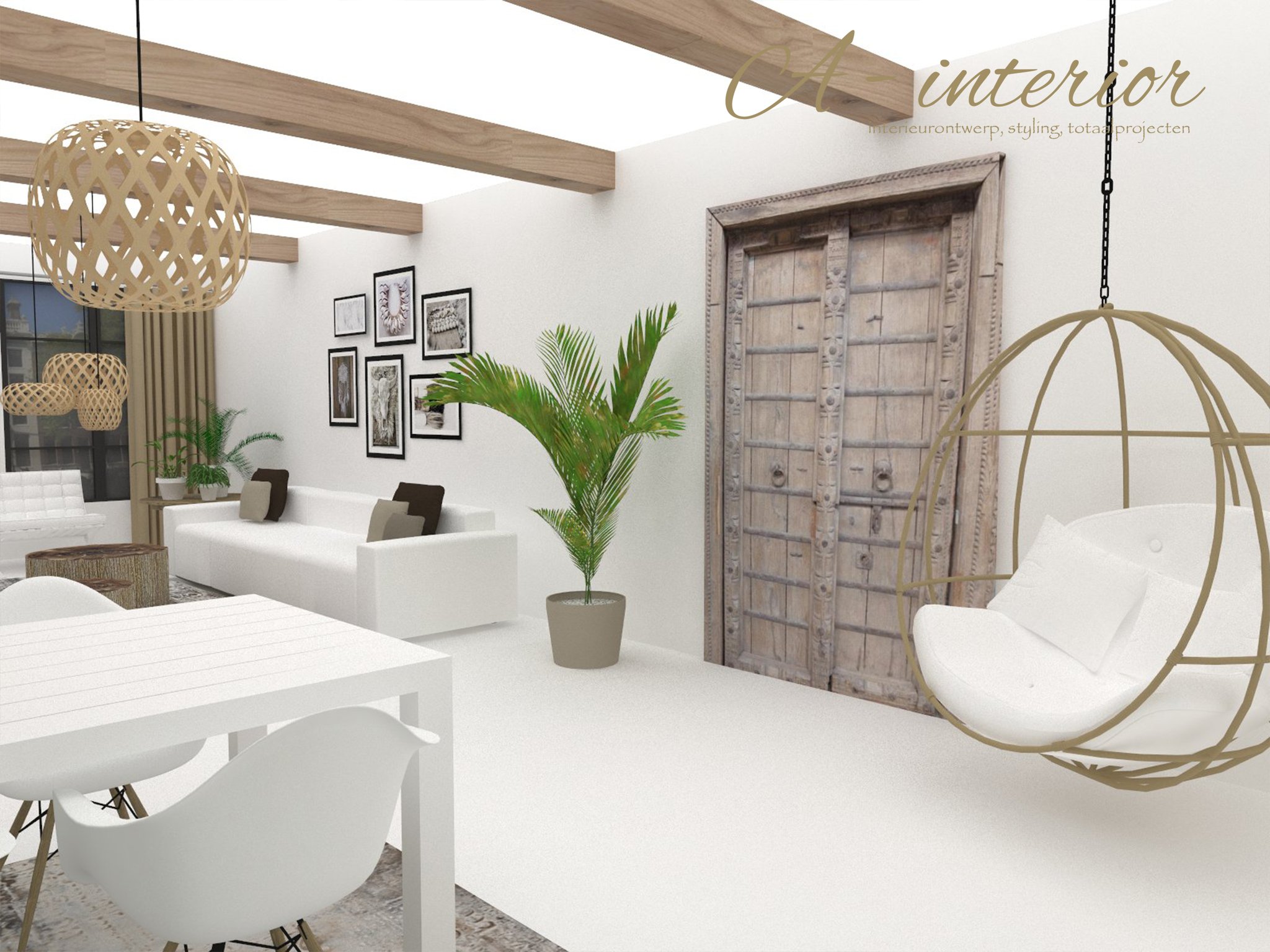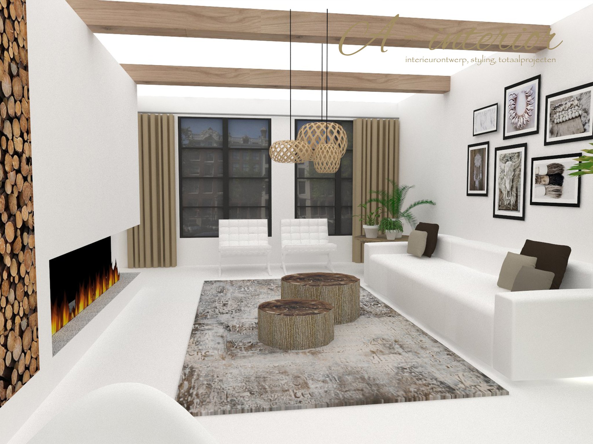 Bij deze woning in Amsterdam, was de opdracht, het ontwerpen van de woonruimte. De klant wilde een lichte ruimte met weinig kleur. A-interior heeft ervoor gekozen om als hoofdkleur wit te gebruiken, met hout en riet accenten. Zodat de bestaande balken tegen het plafond, versterkt worden. Om kleur in de ruimte te brengen is er gekozen voor veel planten.